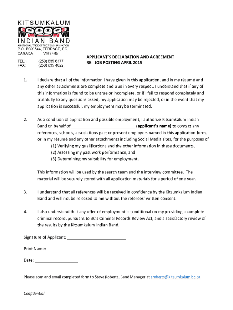 APPLICANTS DECLARATION AND AGREEMENT RE: JOB POSTING APRIL 2019 1. I declare that all the information I have given in this application, and in my sum and any other attachments are complete and true