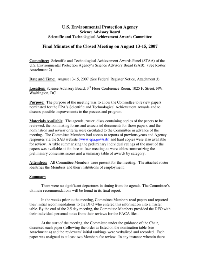 U.S. Environmental Protection Agency Science Advisory Board Scientific and Technological Achievement Awards CommitteeFinal Minutes of the Closed Meeting on August 1315, 2007 Committee: Scientific