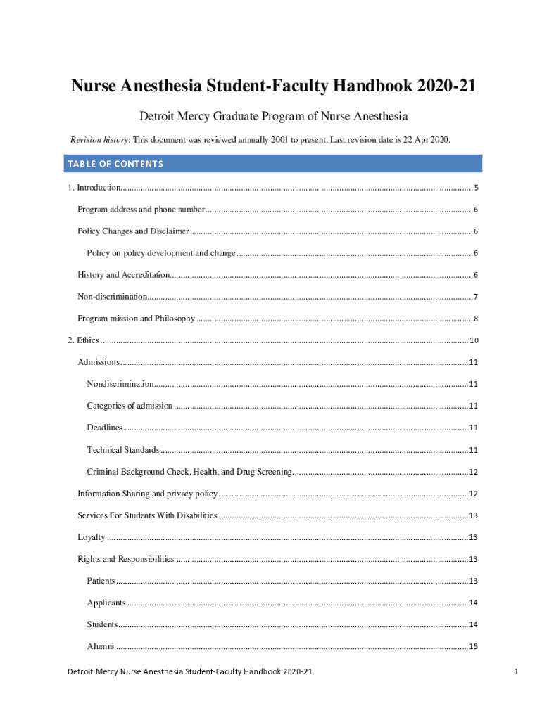 Nurse Anesthesia StudentFaculty Handbook 202021 Detroit Mercy Graduate Program of Nurse Anesthesia Revision history: This document was reviewed annually 2001 to present. Last revision date is 22 Apr