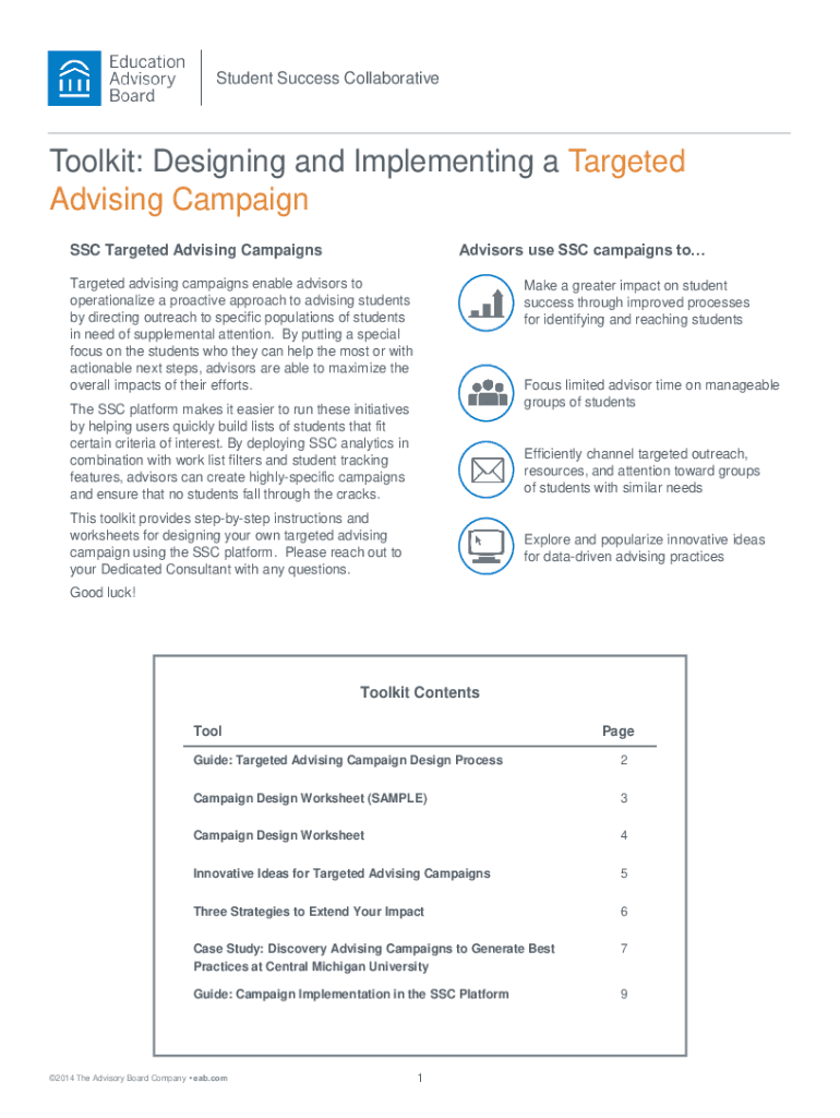 Student Success CollaborativeToolkit: Designing and Implementing a Targeted Advising Campaign Advisors use SSC campaigns toss Targeted Advising Campaigns Targeted advising campaigns enable advisors