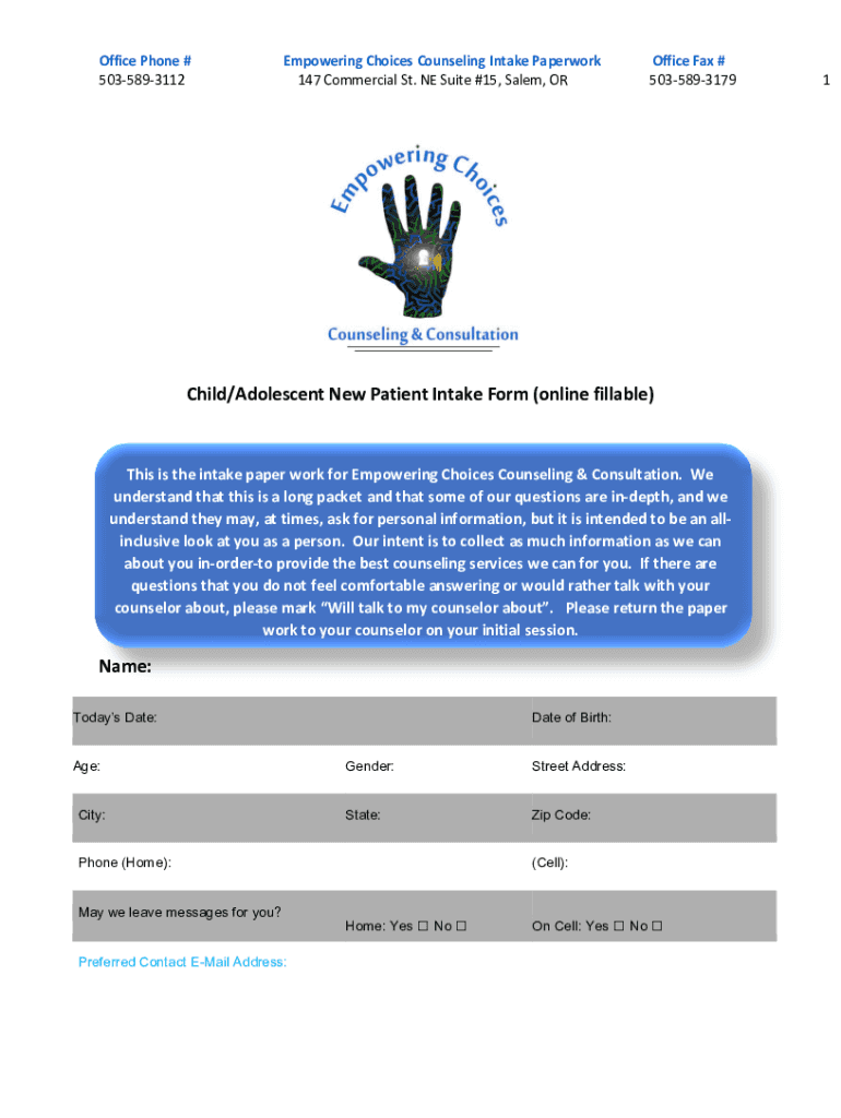 Office Phone # 5035893112Empowering Choices Counseling Intake Paperwork 147 Commercial St. NE Suite #15, Salem, Office Fax # 5035893179Child/Adolescent New Patient Intake Form (online fillable)This