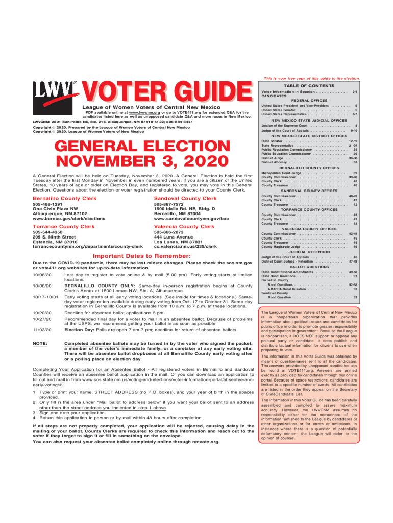 This is your free copy of this guide to the election. VOTER GUIDE League of Women Voters of Central New Mexico PDF available online at www.lwvcnm.org or go to VOTE411.org for extended Q&A for the