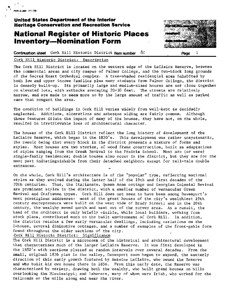 FHR8300(1178)United States Department of the Interior Heritage Conservation and Recreation ServiceNational Register of Historic Places InventoryNomination Form Continuation sheet Cork Hill Historic