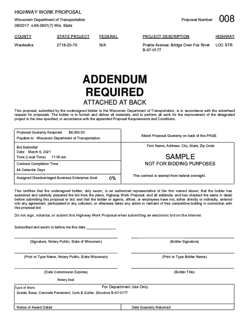 HIGHWAY WORK PROPOSAL Wisconsin Department of Transportation 06/2017 s.66.0901(7) Wis. Stats008Proposal Number:COUNTYSTATE PROJECTFEDERALPROJECT DESCRIPTIONHIGHWAYWaukesha27182070N/Prairie Avenue;