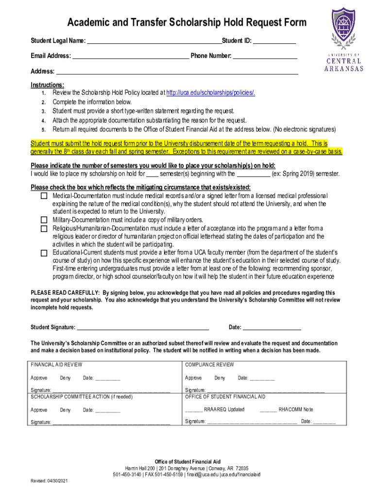 Academic and Transfer Scholarship Hold Request Form Student Legal Name: Student ID: Email Address: Phone Number: Address: Instructions: 1. Review the Scholarship Hold Policy located at http://uca.edu/scholarships/policies/.