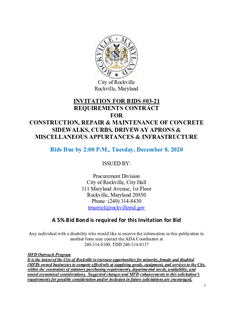City of Rockville, MarylandINVITATION FOR BIDS #0321 REQUIREMENTS CONTRACT FOR CONSTRUCTION, REPAIR & MAINTENANCE OF CONCRETE SIDEWALKS, CURBS, DRIVEWAY APRONS & MISCELLANEOUS APPURTENANCES & INFRASTRUCTURE