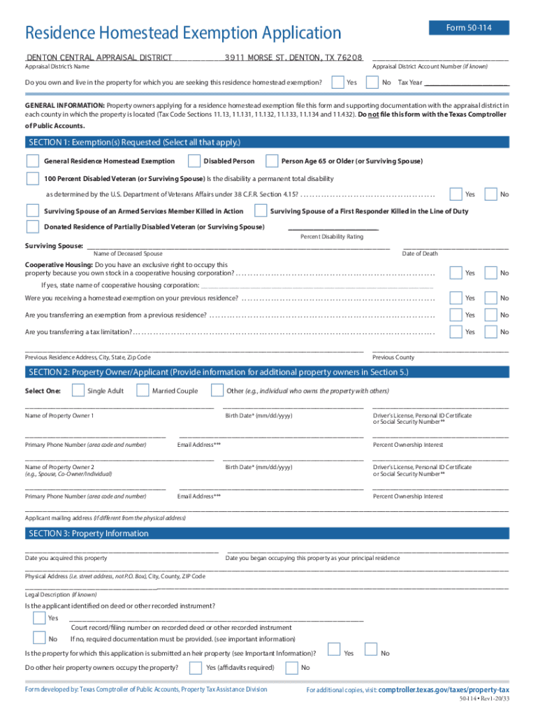 Residence Homestead Exemption ApplicationForm 50114 DENTON CENTRAL APPRAISAL DISTRICT 3911 MORSE ST. DENTON, TX 76208 Appraisal District Account Number (if known)Appraisal Districts Named you own