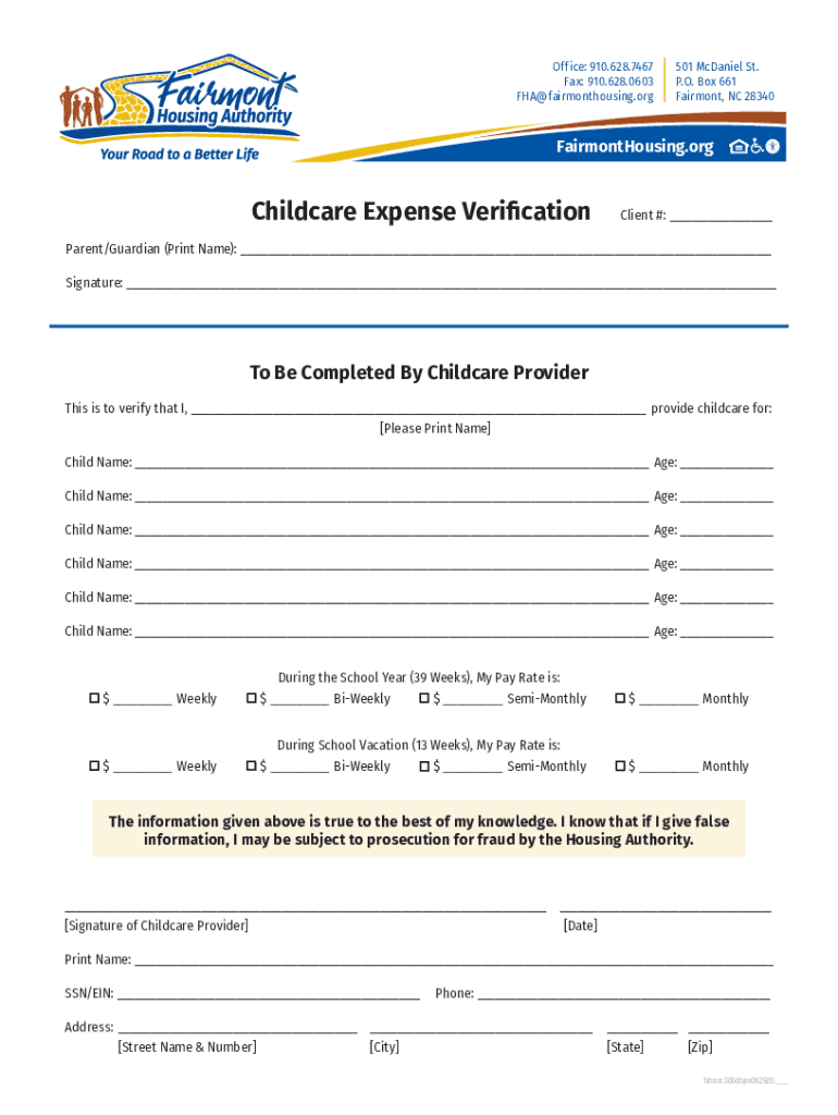 Office: 910.628.7467 Fax: 910.628.0603 FHA fairmonthousing.org501 McDaniel St. P.O. Box 661 Fairmont, NC 28340FairmontHousing. Childcare Expense VerificationClient #: Parent/Guardian (Print Name):