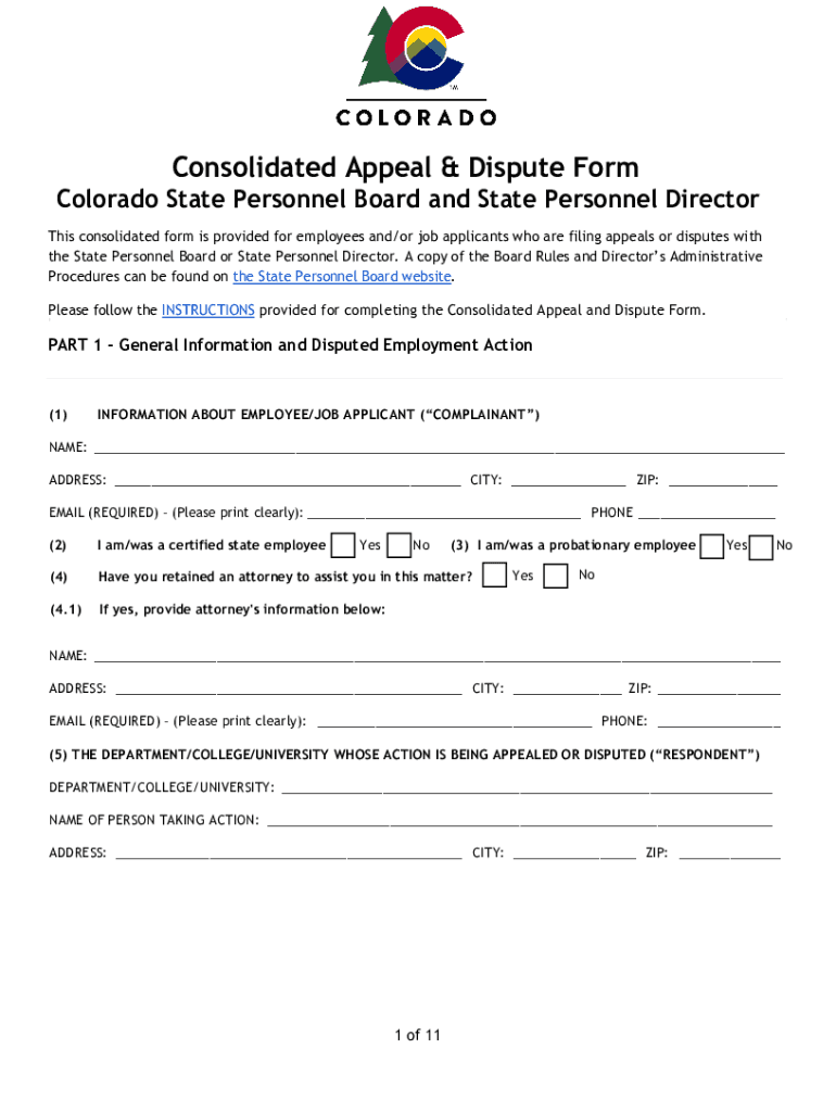Consolidated Appeal & Dispute Form Colorado State Personnel Board and State Personnel Director This consolidated form is provided for employees and/or job applicants who are filing appeals or disputes