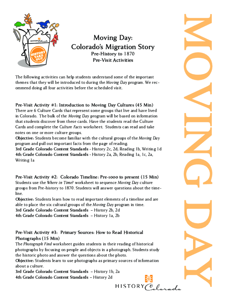 Prehistory to 1870 Revisit Activities The following activities can help students understand some of the important themes that they will be introduced to during the Moving Day program. We recommend