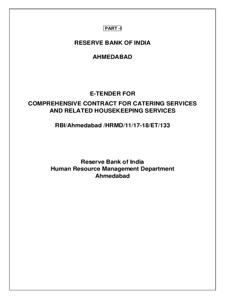 PART RESERVE BANK OF INDIA AHMEDABADETENDER FOR COMPREHENSIVE CONTRACT FOR CATERING SERVICES AND RELATED HOUSEKEEPING SERVICES RBI/Ahmedabad /HMD/11/1718/ET/133Reserve Bank of India Human Resource