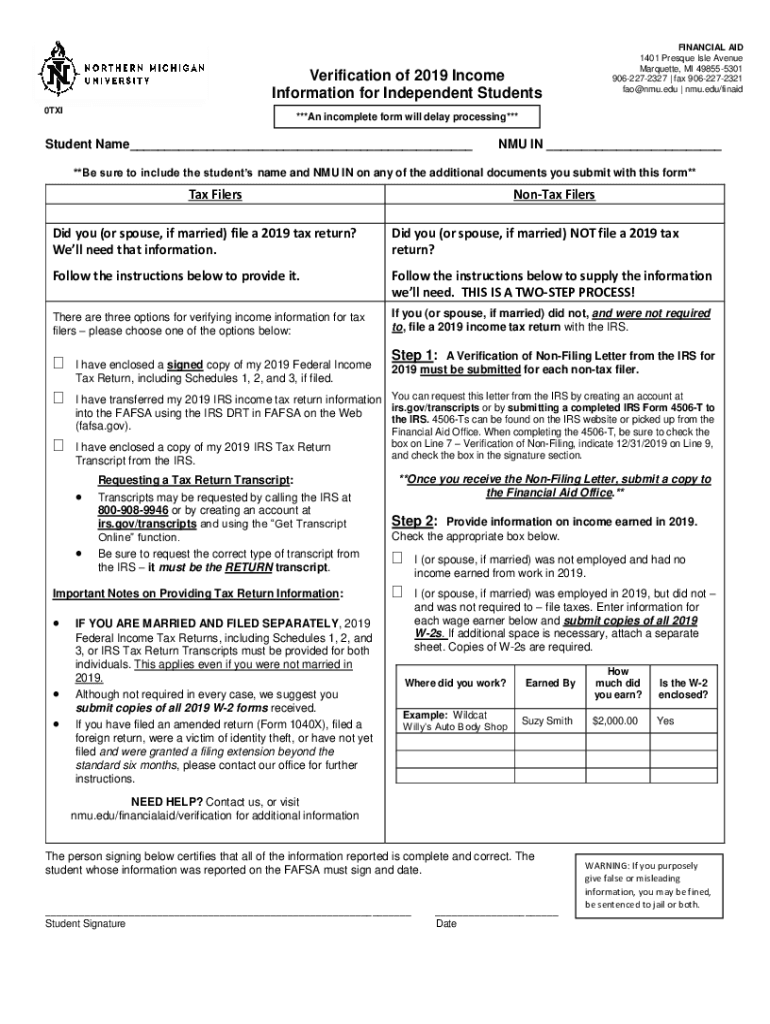 FINANCIAL AID 1401 Pressure Isle Avenue Marquette, MI 498555301 9062272327 fax 9062272321 FAO NMR.edu nmu.edu/finaidVerification of 2019 Income Information for Independent Students 0TXI***An incomplete