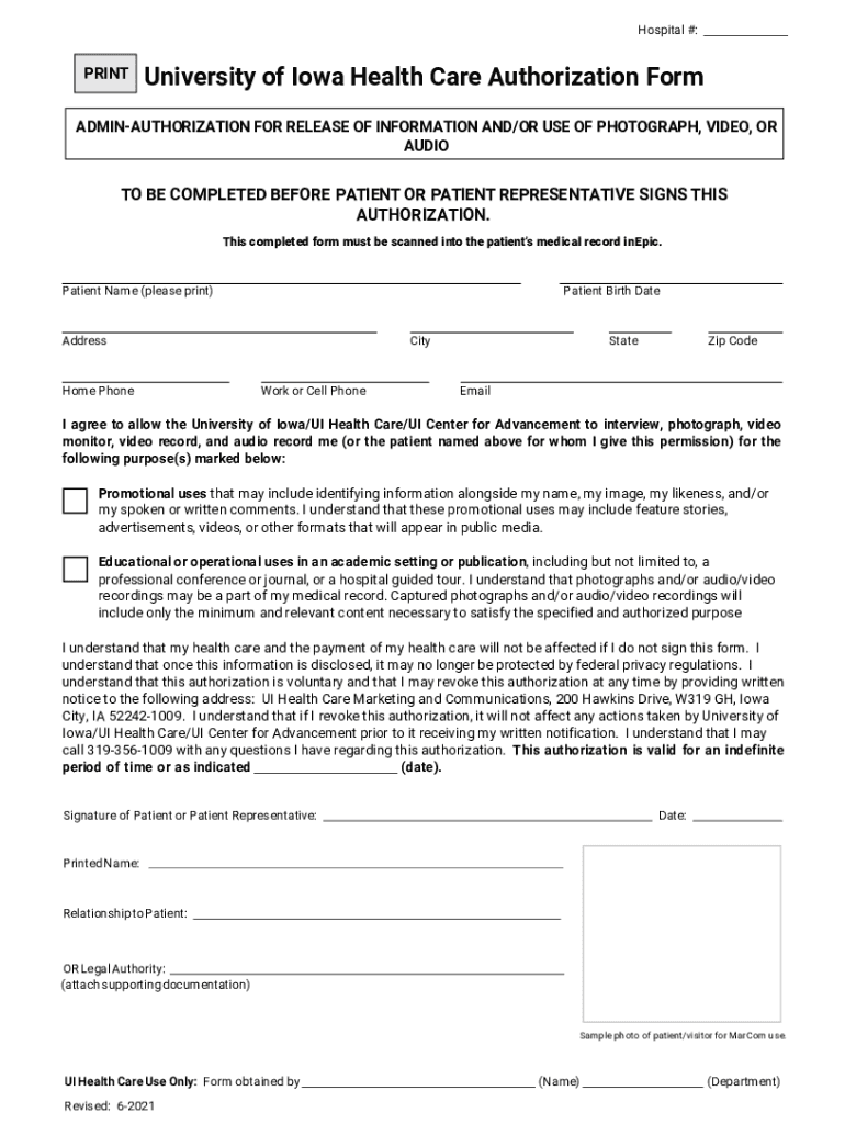 Hospital #:Pre-university of Iowa Health Care Authorization FormADMINAUTHORIZATION FOR RELEASE OF INFORMATION AND/OR USE OF PHOTOGRAPH, VIDEO, OR AUDIO TO BE COMPLETED BEFORE PATIENT OR PATIENT REPRESENTATIVE