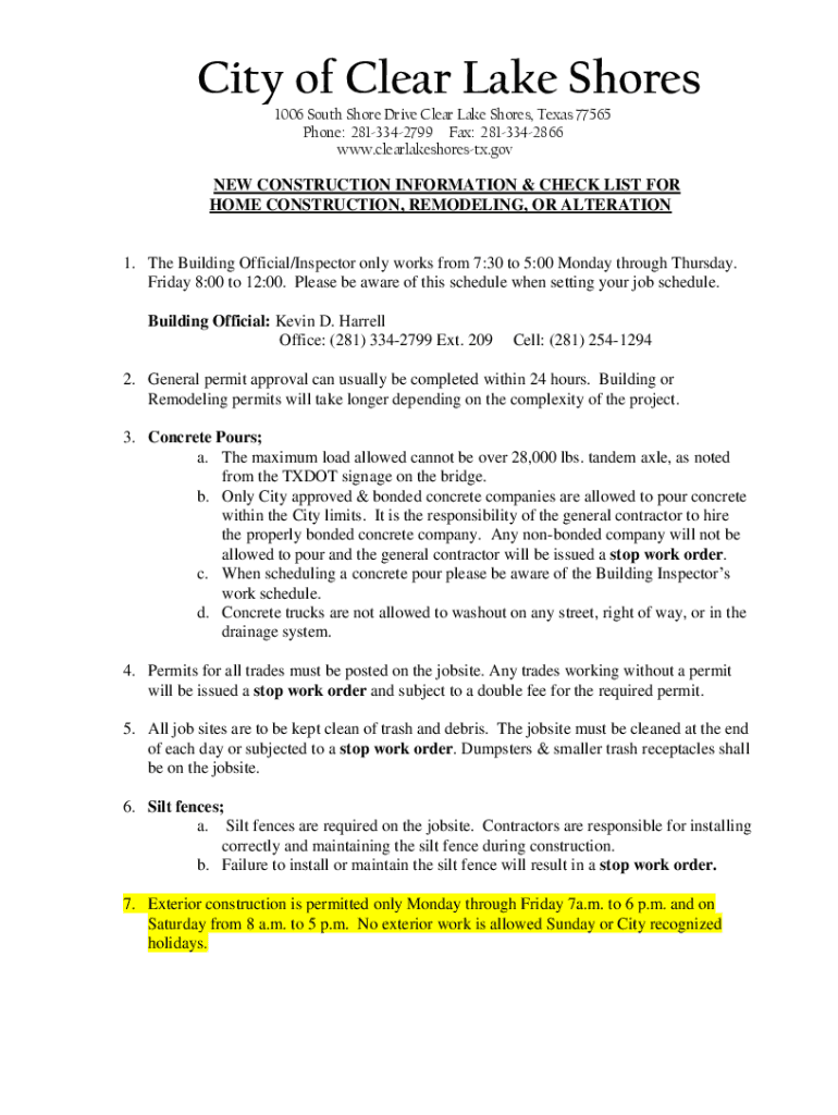 City of Clear Lake Shores 1006 South Shore Drive Clear Lake Shores, Texas 77565 Phone: 2813342799 Fax: 2813342866 www.clearlakeshorestx.govNEW CONSTRUCTION INFORMATION & CHECK LIST FOR HOME CONSTRUCTION,