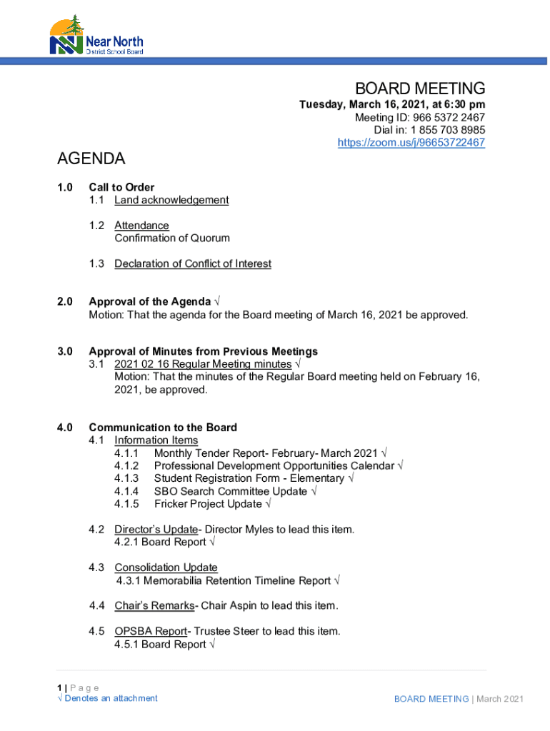 BOARD MEETINGAGENDA 1.0Tuesday, March 16, 2021, at 6:30 pm Meeting ID: 966 5372 2467 Dial in: 1 855 703 8985 https://zoom.us/j/96653722467Call to Order 1.1 Land acknowledgement 1.2 Attendance Confirmation
