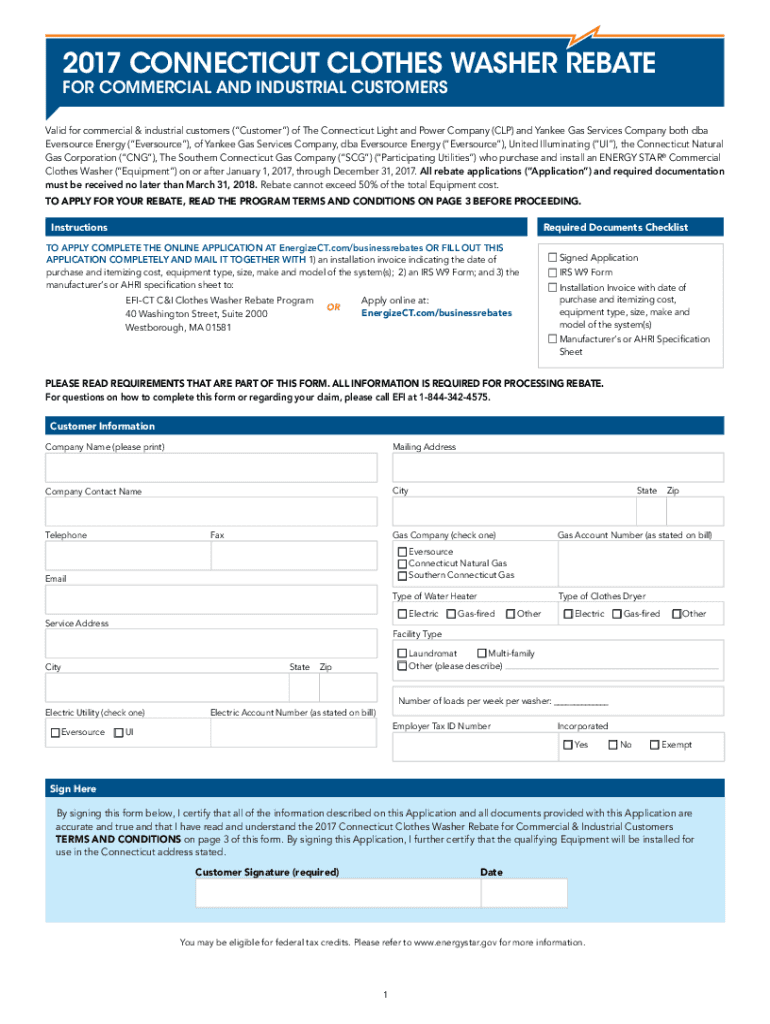 2017 CONNECTICUT CLOTHES WASHER REBATE FOR COMMERCIAL AND INDUSTRIAL CUSTOMERSValid for commercial & industrial customers (Customer) of The Connecticut Light and Power Company (CLP) and Yankee Gas