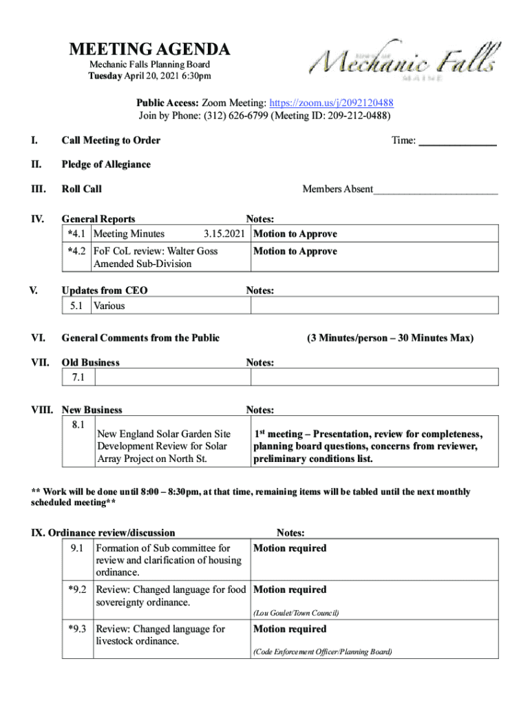 MEETING AGENDA Mechanic Falls Planning Board Tuesday, April 20, 2021 6:30pmPublic Access: Zoom Meeting: https://zoom.us/j/2092120488 Join by Phone: (312) 6266799 (Meeting ID: 2092120488) I. Call Meeting