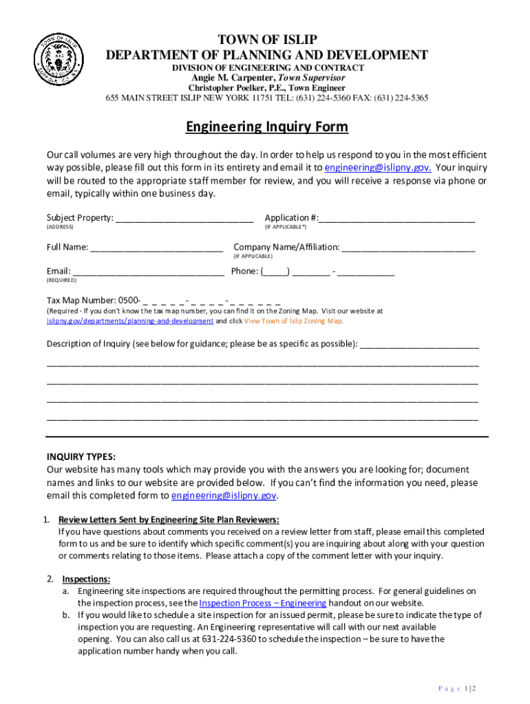 TOWN OF SLIP DEPARTMENT OF PLANNING AND DEVELOPMENT DIVISION OF ENGINEERING AND CONTRACT Angie M. Carpenter, Town Supervisor Christopher Poker, P.E., Town Engineer 655 MAIN STREET SLIP NEW YORK 11751