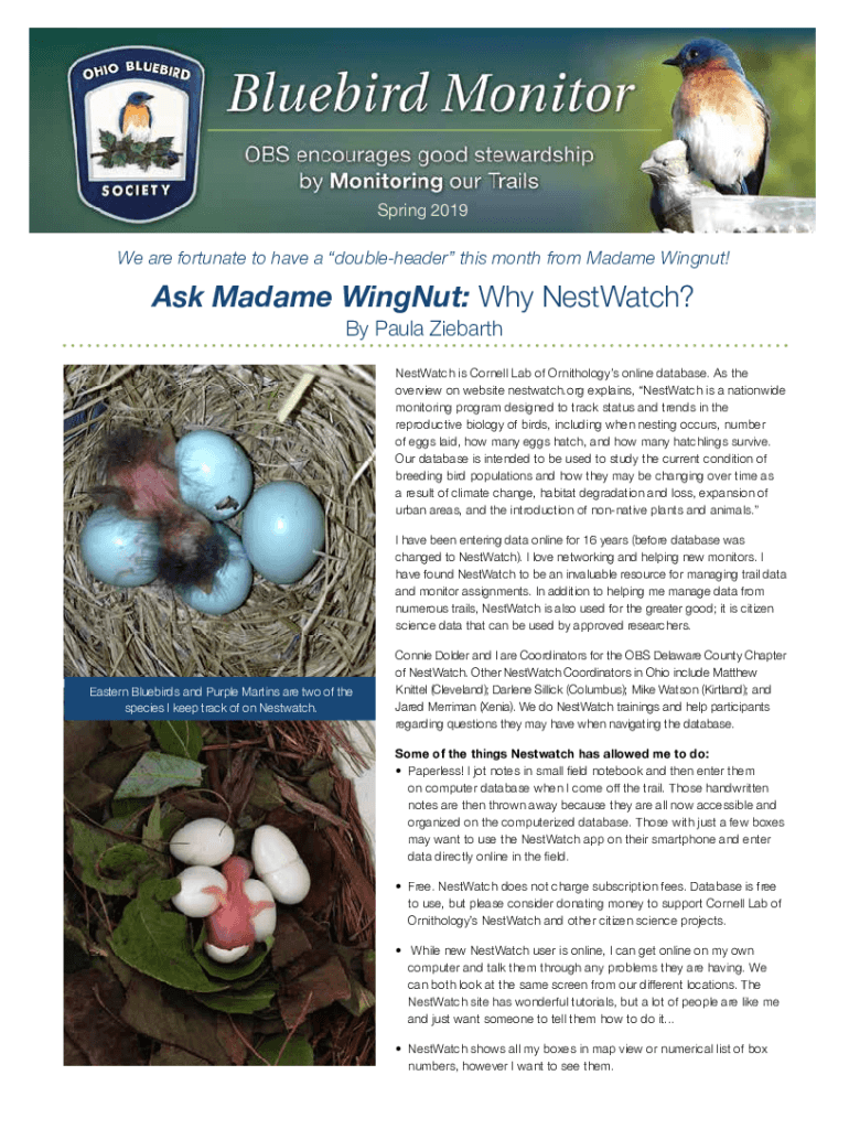 Spring 2019We are fortunate to have a doubleheader this month from Madame Wingnut! Ask Madame Wingnut: Why Wristwatch? By Paula ZiebarthNestWatch is Cornell Lab of Ornithology online database. As