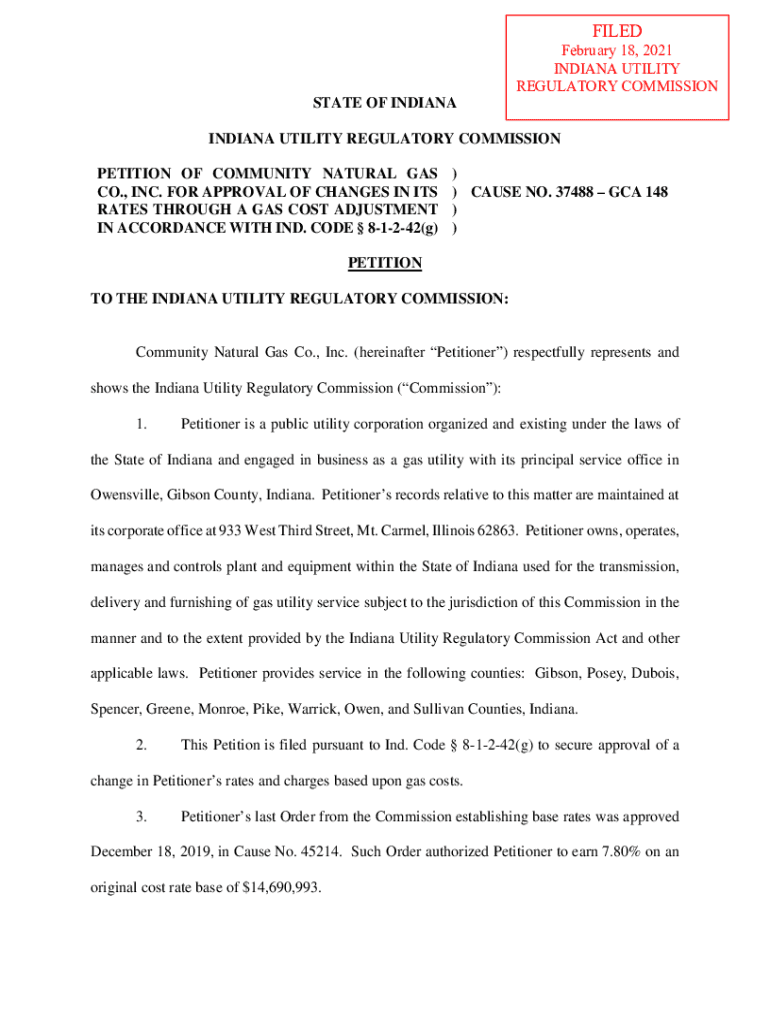 FILED February 18, 2021, INDIANA UTILITY REGULATORY COMMISSION STATE OF INDIANA UTILITY REGULATORY COMMISSION PETITION OF COMMUNITY NATURAL GAS CO., INC. FOR APPROVAL OF CHANGES IN ITS RATES THROUGH