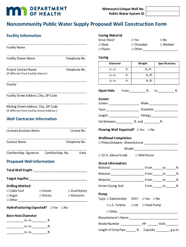 Minnesota Unique Well No. Public Water System IDNoncommunity Public Water Supply Proposed Well Construction Form Facility InformationCasing Material Facility Name Facility Owner NameTelephone No.