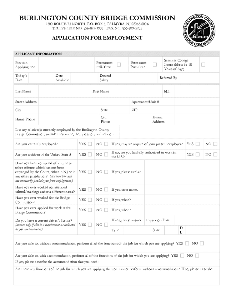 BURLINGTON COUNTY BRIDGE COMMISSION 1300 ROUTE 73 NORTH, P.O. BOX 6, PALMYRA, NJ 080650006 TELEPHONE NO. 8568291900 FAX NO. 8568295205APPLICATION FOR EMPLOYMENT APPLICANT INFORMATIONPosition Applying