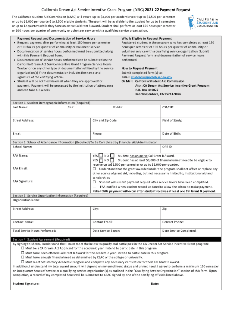 California Dream Act Service Incentive Grant Program (DIG) 202122 Payment Request The California Student Aid Commission (CSA) will award up to $3,000 per academic year (up to $1,500 per semester or