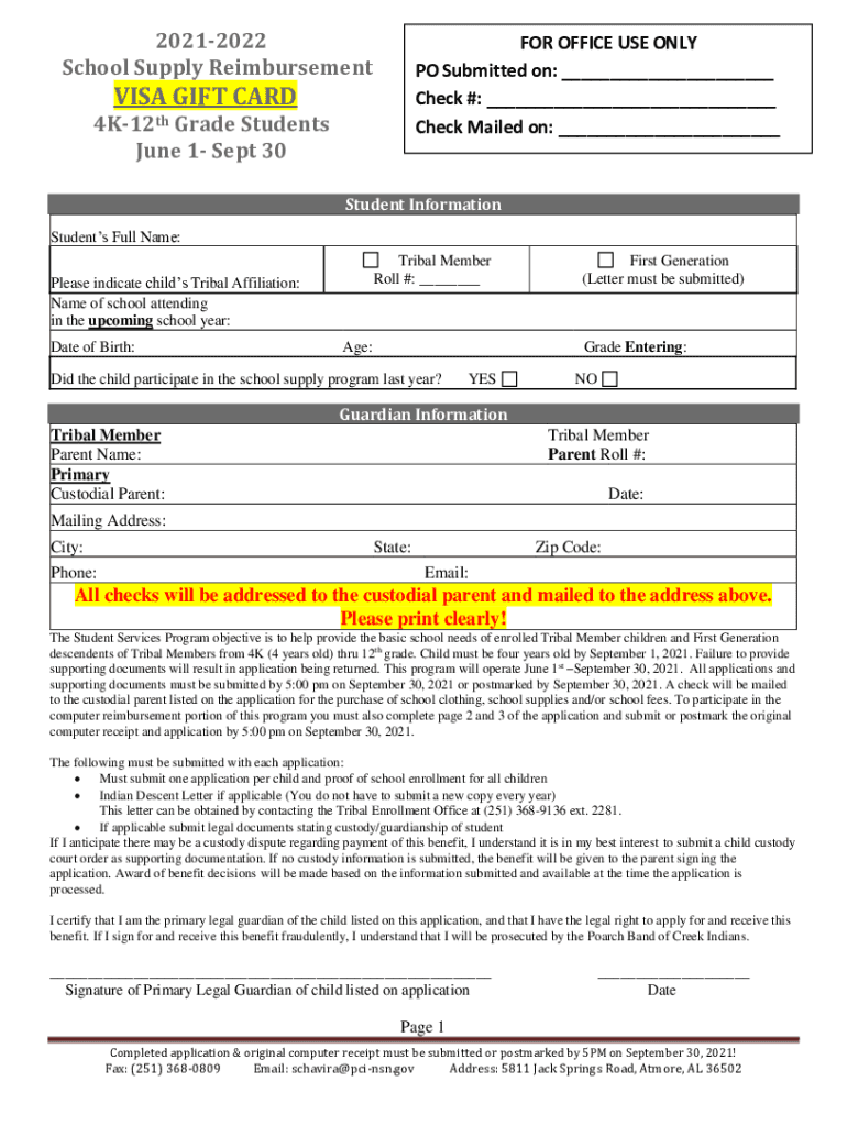 20212022 School Supply Reimbursement OFFICE USE ONLY PO Submitted on: Check #: Check Mailed on: VISA GIFT CARD4K12th Grade Students June 1 Sept 30Student Information Students Full Name: Tribal Member