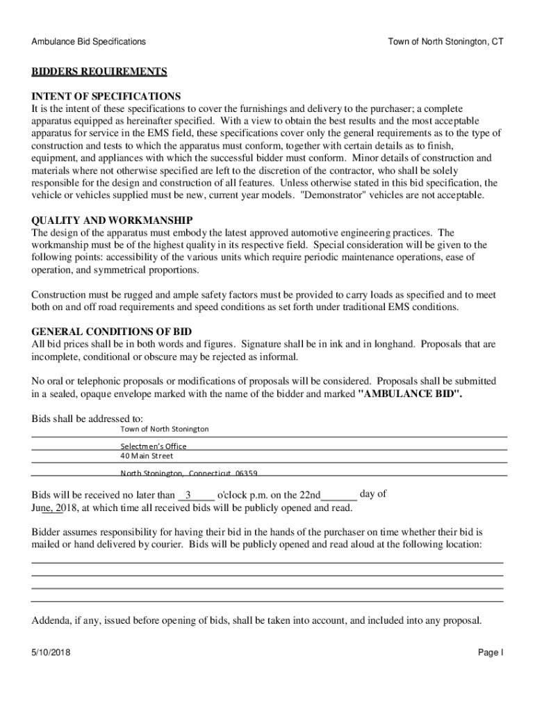 Ambulance Bid SpecificationsTown of North Stoning ton, BIDDERS REQUIREMENTS INTENT OF SPECIFICATIONS It is the intent of these specifications to cover the furnishings and delivery to the purchaser;