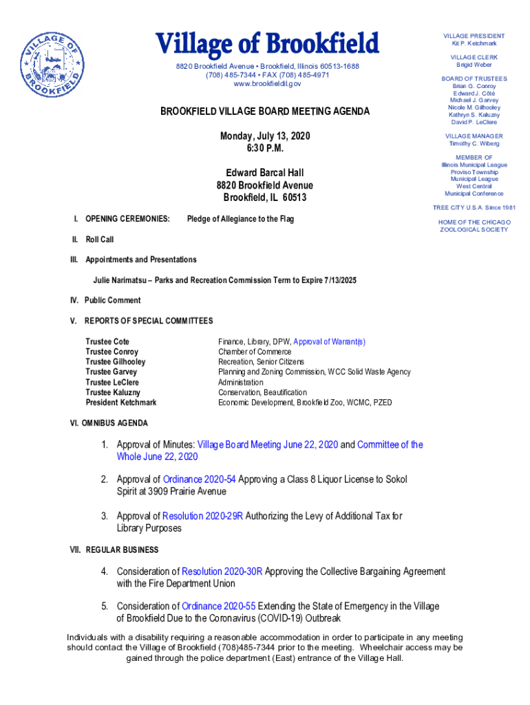 To COW Agenda VILLAGE PRESIDENT Kit P. Ketch mark VILLAGE CLERK Brigid Weber8820 Brookfield Avenue Brookfield, Illinois 605131688 (708) 4857344 FAX (708) 4854971 www.brookfieldil.gov1105BOARD OF TRUSTEES