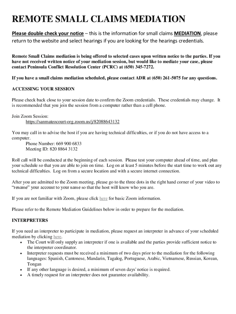 REMOTE SMALL CLAIMS MEDIATION Please double-check your notice this is the information for small claims MEDIATION, please return to the website and select hearings if you are looking for the hearings
