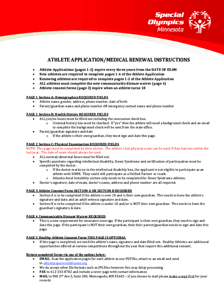 ATHLETE APPLICATION/MEDICAL RENEWAL INSTRUCTIONS Athlete Applications (pages 12) expire every three years from the DATE OF EXAM New athletes are required to complete pages 14 of the Athlete Application