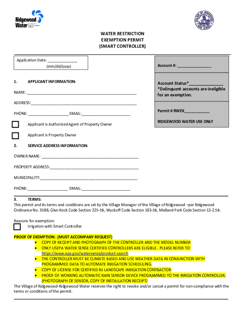 WATER RESTRICTION EXEMPTION PERMIT (SMART CONTROLLER) Application Date: (mm/dd/YYY) 1.APPLICANT INFORMATION:NAME: Account #: Account Status* *Delinquent accounts are ineligible for an exemption.ADDRESS: