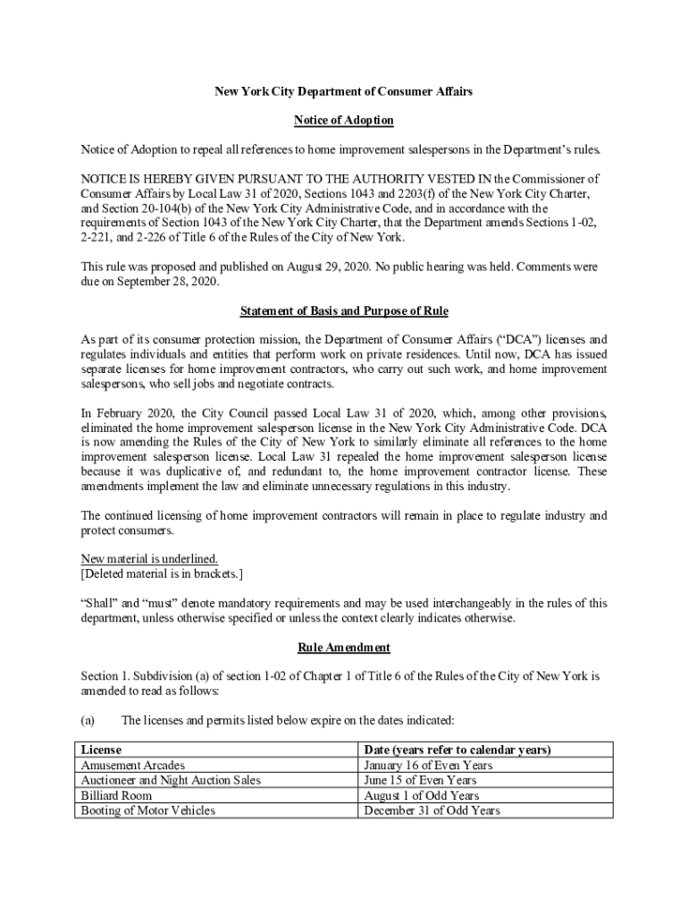 New York City Department of Consumer Affairs Notice of Adoption Notice of Adoption to repeal all references to home improvement salespersons in the Departments rules. NOTICE IS HEREBY GIVEN PURSUANT