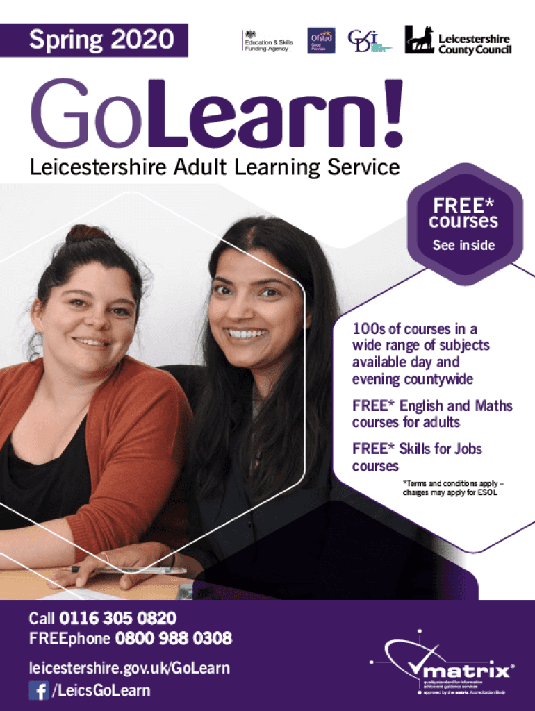 Spring 2020GoLearn! Leicestershire Adult Learning Servicemen* courses See inside100s of courses in a wide range of subjects available day and evening countywide FREE* English and Math courses for