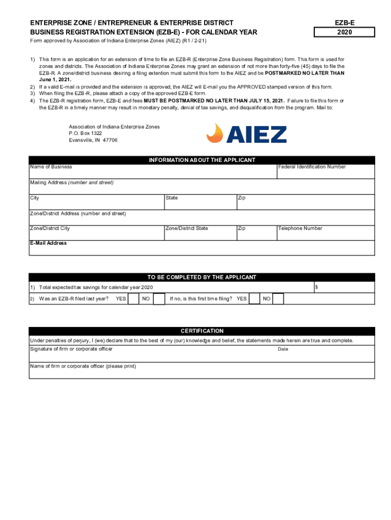 ENTERPRISE ZONE / ENTREPRENEUR & ENTERPRISE DISTRICT BUSINESS REGISTRATION EXTENSION (ELBE) FOR CALENDAR EARLOBE 2020Form approved by Association of Indiana Enterprise Zones (AEZ) (R1 / 221)1) This