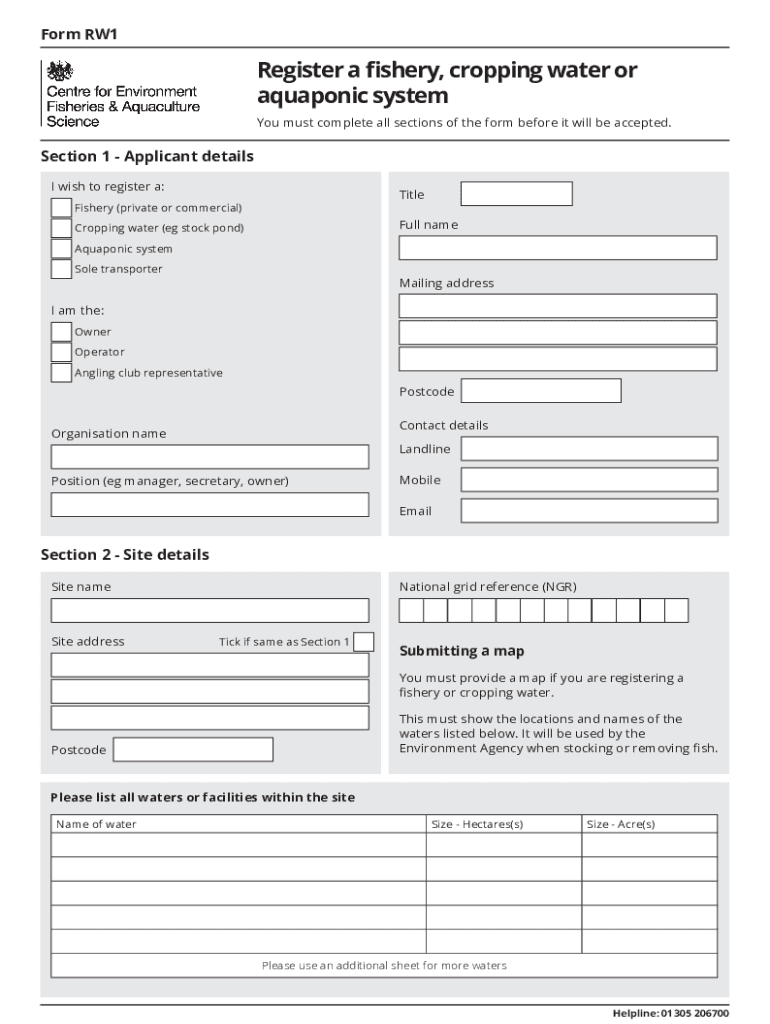 Form RW1Register a fishery, cropping water or aquaponic system You must complete all sections of the form before it will be accepted. Section 1 Applicant details I wish to register a:TitleFishery