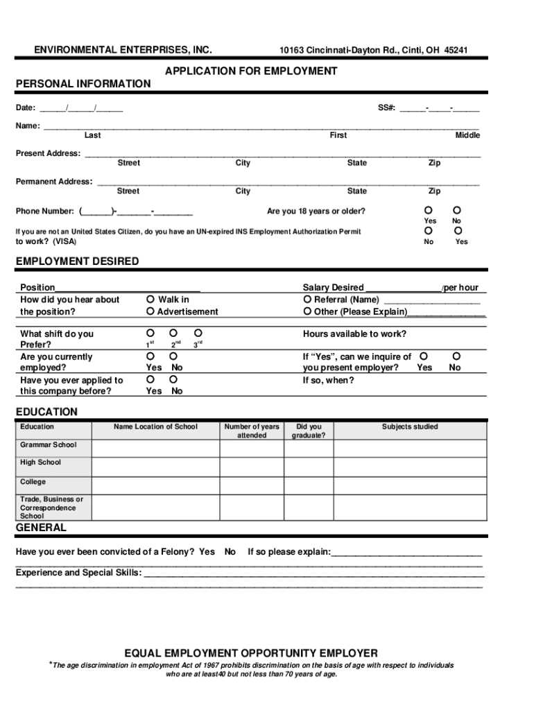 ENVIRONMENTAL ENTERPRISES, INC.10163 Cincinnati Dayton Rd., Into, OH 45241APPLICATION FOR EMPLOYMENT PERSONAL INFORMATION Date: / / SS#: Name: Last First Middle Present Address: Street City State