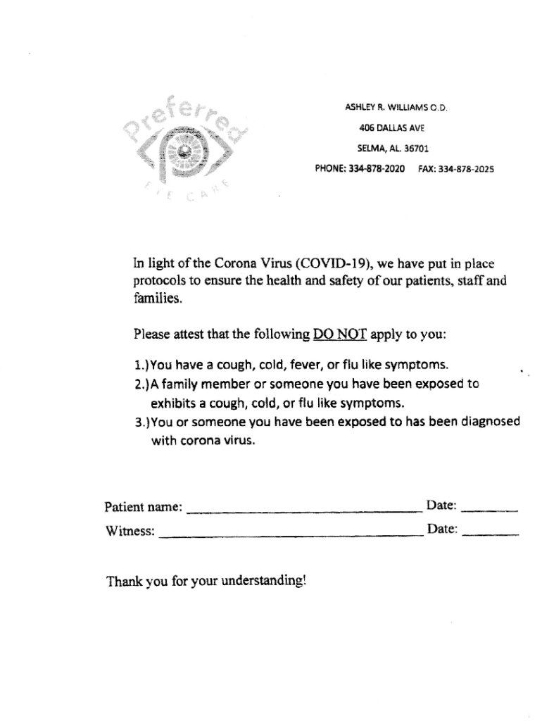 ASHLEY R. WILLIAMS C.D. 1106 DALLAS SELMA AL 36701PHONE:334782020 Fax:3348782025In light of the Coronavirus (COVIDI9), we have put in place protocols to ensure the health and safety four patients,