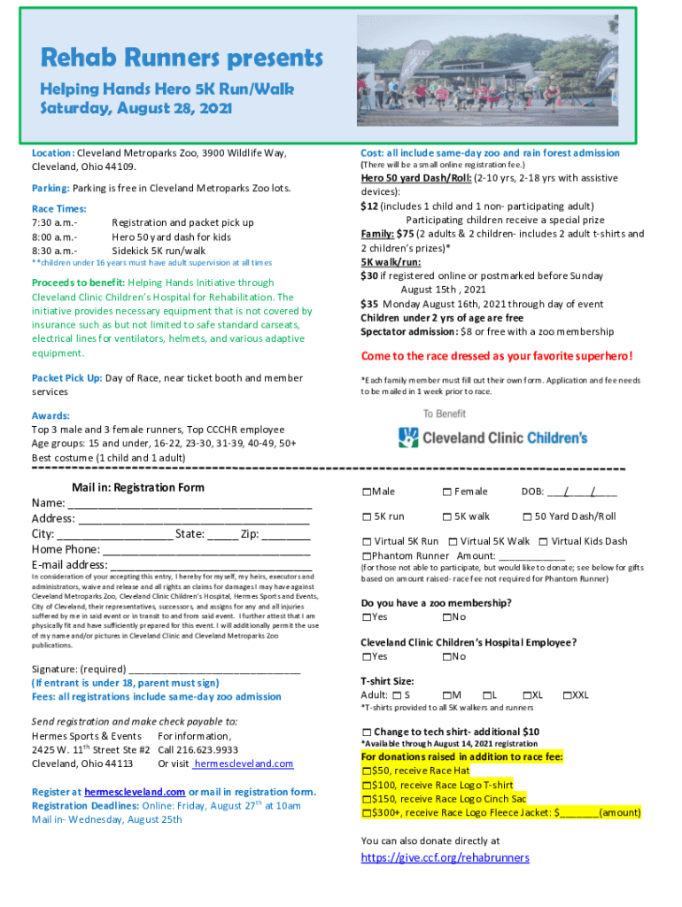 Rehab Runners presents Helping Hands Hero 5K Run/Walk Saturday, August 28, 2021, Location: Cleveland Metro parks Zoo, 3900 Wildlife Way, Cleveland, Ohio 44109. Parking: Parking is free in Cleveland
