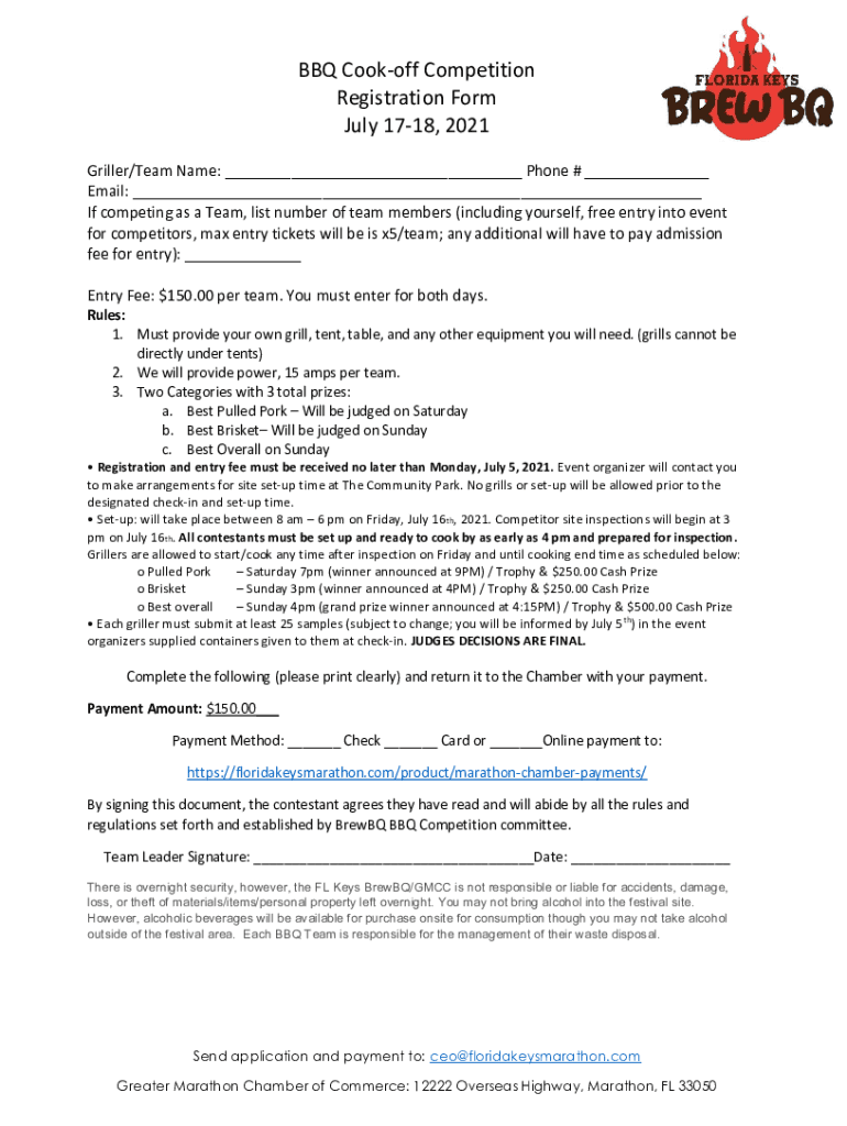 BBQ Cook off Competition Registration Form July 1718, 2021 Grille/Team Name: Phone # Email: If competing as a Team, list number of team members (including yourself, free entry into event for competitors,