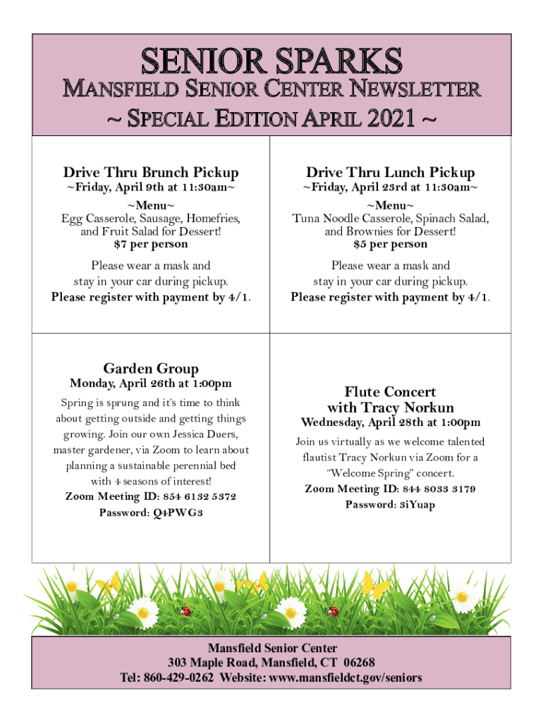 SENIOR SPARKSMANSFIELD SENIOR CENTER NEWSLETTER SPECIAL EDITION APRIL 2021 Drive Through Brunch PickupDrive Through Lunch Pickup Friday, April 9th at 11:30am Menu Egg Casserole, Sausage, Home fries,