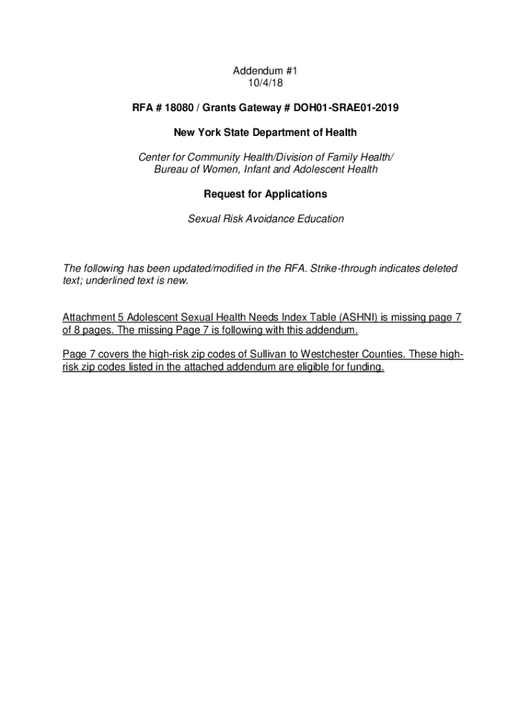 Addendum #1 10/4/18 RFA # 18080 / Grants Gateway # DOH01SRAE012019 New York State Department of Health Center for Community Health/Division of Family Health/ Bureau of Women, Infant and Adolescent