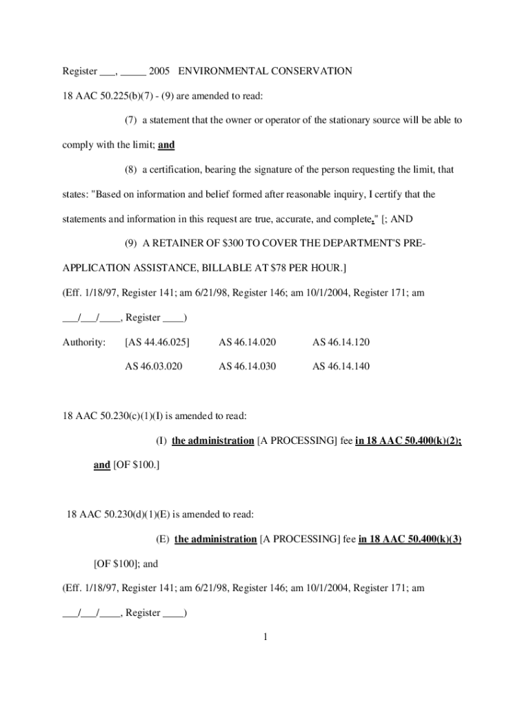 Register, 2005 ENVIRONMENTAL CONSERVATION 18 AAC 50.225(b)(7) (9) are amended to read: (7) a statement that the owner or operator of the stationary source will be able to comply with the limit; and