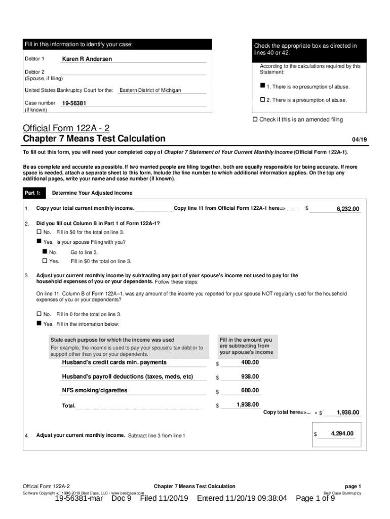 Fill in this information to identify your case: Debtor 1Check the appropriate box as directed in lines 40 or 42:Karen R Andersen According to the calculations required by this Statement:Debtor 2 (Spouse,