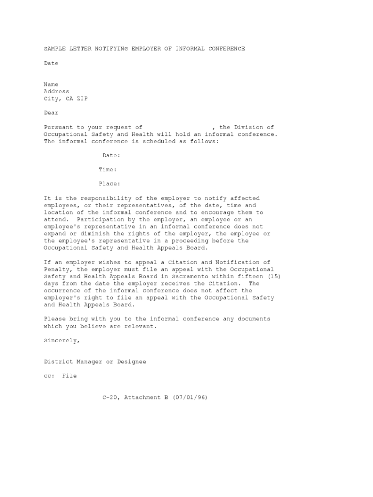 SAMPLE LETTER NOTIFYING EMPLOYER OF INFORMAL CONFERENCE Date Name Address City, CA ZIP Dear Pursuant to your request of, the Division of Occupational Safety and Health will hold an informal conference.