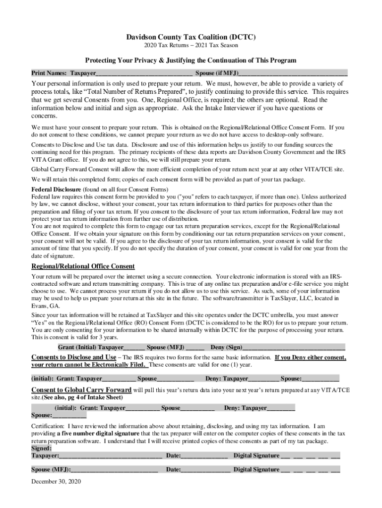 Davidson County Tax Coalition (CTC) 2020 Tax Returns 2021 Tax SeasonProtecting Your Privacy & Justifying the Continuation of This Program Print Names: Taxpayer Spouse (if MFA) Your personal information