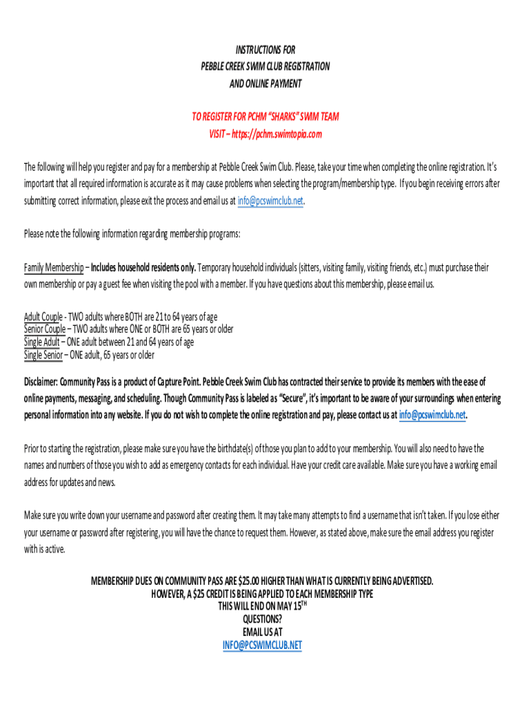 INSTRUCTIONS FOR PEBBLE CREEK SWIM CLUB REGISTRATION AND ONLINE PAYMENT TO REGISTER FOR PCM SHARKS SWIM TEAM VISIT https://pchm.swimtopia.com The following will help you register and pay for a membership