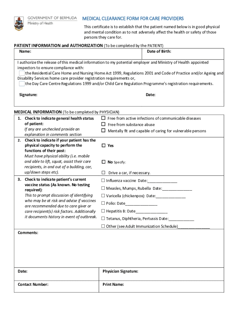 MEDICAL CLEARANCE FORM FOR CARE PROVIDERS This certificate is to establish that the patient named below is in good physical and mental condition as to not adversely affect the health or safety of
