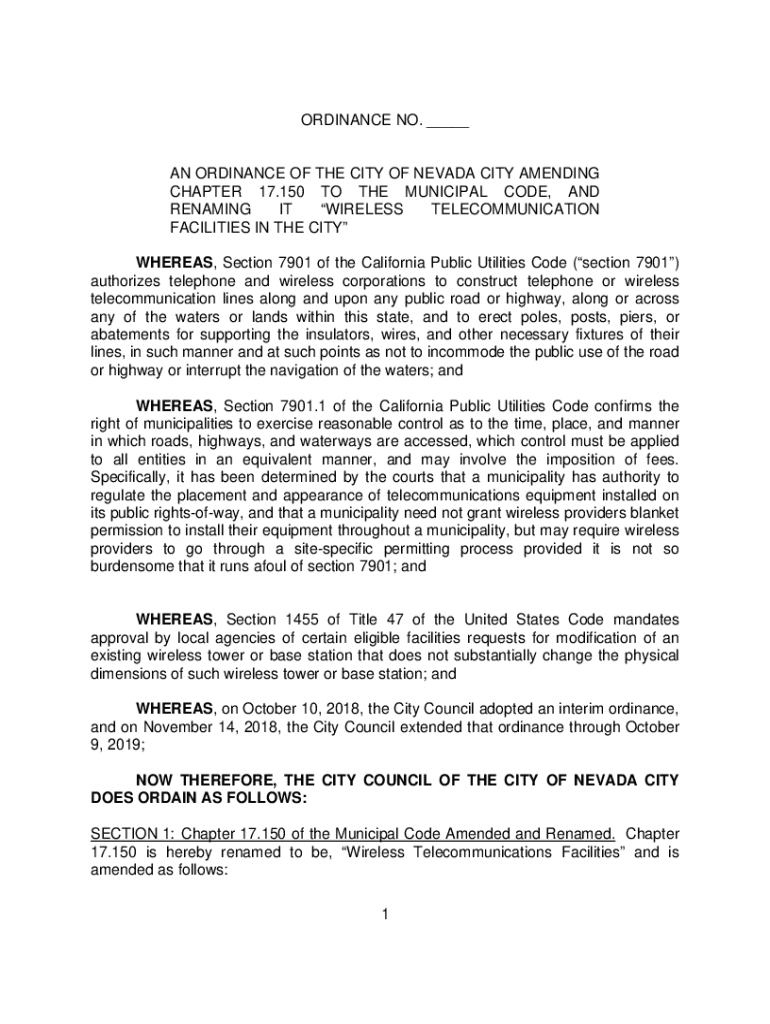 ORDINANCE NO. AN ORDINANCE OF THE CITY OF NEVADA CITY AMENDING CHAPTER 17.150 TO THE MUNICIPAL CODE, AND RENAMING IT WIRELESS TELECOMMUNICATION FACILITIES IN THE CITY WHEREAS, Section 7901 of the